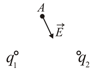 1.4. На рисунке показано направление вектора напряженности электрического поля точечных зарядов q1 и q2 в точке A. Определить знак зарядов q1 и q2.