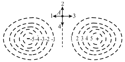 1.16. На рисунке показаны эквипотенциальные линии электрического поля системы зарядов и значения потенциала на них. Определить направление вектора напряженности электрического поля в точке А.