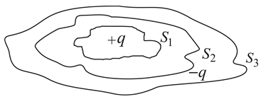 1.27. Дана система точечных зарядов и замкнутые поверхности S1, S2, S3. Через какие поверхности поток вектора напряженности электрического поля не равен нулю?