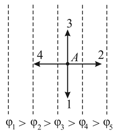 1.34. Электростатическое поле на плоскости изображено системой эквипотенциальных линий. Какой из векторов, построенных в точке А, совпадает по направлению с вектором напряженности электрического поля?