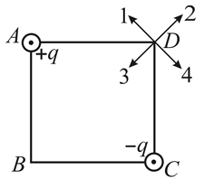 1.40. В вершинах А и С квадрата находятся равные по величине, но разные по знаку точечные заряды. Какой из векторов, построенных в вершине D, совпадает по направлению с вектором напряженности электрического поля?