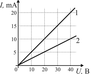 • 2.22. Вольтамперные характеристики резисторов 1 и 2 представлены на рисунке. Какая тепловая мощность выделяется на резисторе 2 при токе 10 мА?