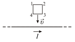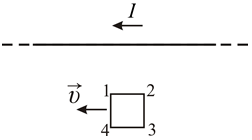 4.4. На рисунке показан длинный проводник с током и проводящая рамка. Определить направление индукционного тока при движении рамки параллельно проводнику.