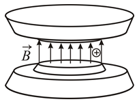 4.25. В постоянном однородном магнитном поле, созданном электромагнитом с дискообразными полюсами, на некотором расстоянии от оси полюсов закреплена положительно заряженная частица. Частица выстреливается так, что вектор ее скорости перпендикулярен силовым линиям магнитного поля и направлен по касательной к окружности, плоскость которой перпендикулярна вектору B, а центр лежит на оси полюсов. Скорость частицы такова, что она движется именно по этой окружности. В некоторый момент ток в обмотках электромагнита начинает увеличиваться. На каком рисунке приведено правильное сочетание направлений векторов скорости и ускорения частицы?