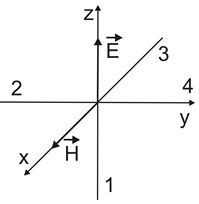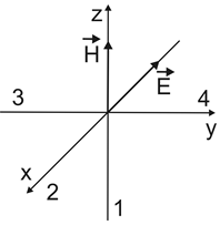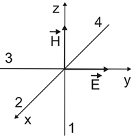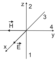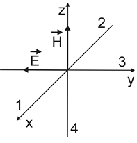 1.23. На рисунке показана ориентация векторов напряженности электрического E и магнитного H полей в электромагнитной волне. Вектор плотности потока энергии электромагнитного поля ориентирован в направлении…