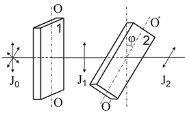 1.49. На пути естественного света помещены две пластинки турмалина. После прохождения пластинки 1 свет полностью поляризован. Если J1 и J2 – интенсивности света, прошедшего пластинки 1 и 2 соответственно, и угол между направлениями OO и O'O' φ=30o, то J1 и J2 связаны соотношением… ![]()