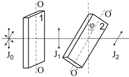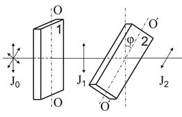 1.50. На пути естественного света помещены две пластинки турмалина. После прохождения пластинки 1 свет полностью поляризован. Если J1 и J2 – интенсивности света, прошедшего пластинки 1 и 2 соответственно, и угол между направлениями OO и O'O' φ=0o, то J1 и J2 связаны соотношением… ![]()