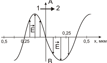 1.61. На рисунке представлена мгновенная фотография электрической составляющей электромагнитной волны, переходящей из среды 1 в среду 2 (АВ граница раздела). Относительный показатель преломления среды 2 относительно среды 1 равен…