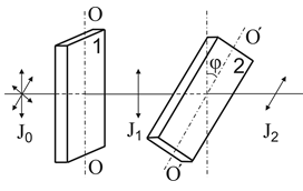 1.53. На пути естественного света помещены две пластинки турмалина. После прохождения пластинки 1 свет полностью поляризован. Если J1 и J2 – интенсивности света, прошедшего пластинки 1 и 2 соответственно, и J2 = J1/4 , то угол между направлениями OO и O'O' равен.. ![]()