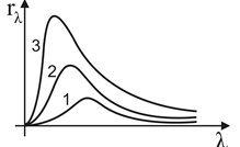 2.6. На рисунке показаны кривые зависимости спектральной плотности энергетической светимости абсолютно черного тела от длины волны при разных температурах. Если длина волны, соответствующая максимуму rλ, уменьшилась в 4 раза, то температура абсолютно черного тела...