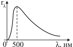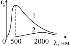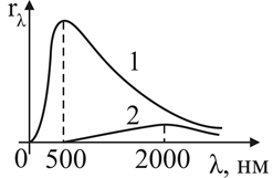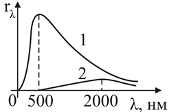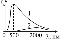 2.8. На рисунке показаны кривые зависимости спектральной плотности энергетической светимости абсолютно черного тела от длины волны при различных температурах. Если кривая 2 соответствует rλ абсолютно черного тела при температуре 1500 К, то кривая 1 соответствует температуре (в К)...