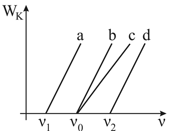 2.17. В опытах по внешнему фотоэффекту изучалась зависимость кинетической энергии Wk фотоэлектронов от частоты падающего света. Для некоторого материала фотокатода эта зависимость представлена линией b. При замене материала фотокатода на материал с меньшей работой выхода зависимость будет соответствовать прямой...
