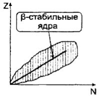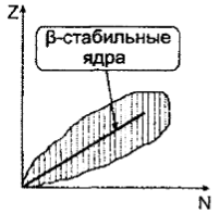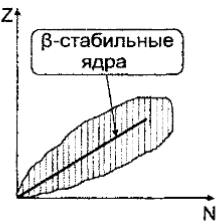 4.8. На рисунке показана область существования β — активных ядер. Прямая линия соответствует равновесным значениям Zβ, соответствующим β-стабильным ядрам. Здесь Z — порядковый номер элемента, а N — число нейтронов в ядре. β- - активные ядра...