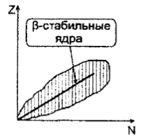 - 4.8. На рисунке показана область существования β — активных ядер. Прямая линия соответствует равновесным значениям Zβ, соответствующим β-стабильным ядрам. Здесь Z — порядковый номер элемента, а N — число нейтронов в ядре. β- - активные ядра...