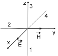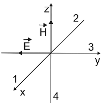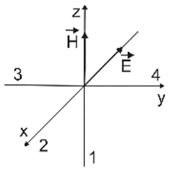 ЗАДАЧА 2. На рисунке показана ориентация векторов напряженности электрического (Е) и магнитного (Н) полей в электромагнитной волне. Вектор плотности потока энергии электромагнитного поля ориентирован в направлении …