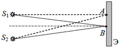• ЗАДАЧА 20. Свет от двух синфазных когерентных источников S1 и S2 с длиной волны λ достигает экрана (см. рис.). На нем наблюдается интерференционная картина. Светлые области в точках А и В наблюдаются потому, что