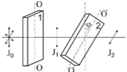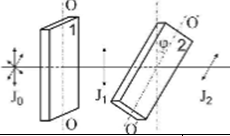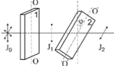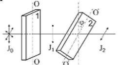 ЗАДАЧА 38. На пути естественного света помещены две пластинки турмалина. После прохождения пластинки 1 свет полностью поляризован. Если J1 и J2 – интенсивности света, прошедшего пластинки соответственно 1 и 2, и угол между направлениями OO и O’O’ равен φ=0о, то J2 и J1 связаны соотношением…