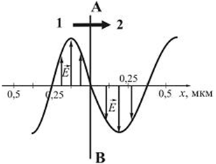 ЗАДАЧА 35. На рисунке представлена мгновенная фотография электрической составляющей электромагнитной волны , переходящей из среды 1 в среду 2 ( АВ граница раздела ). Относительный показатель преломления второй среды относительно первой среды равен ...