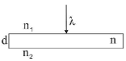 ЗАДАЧА 32. Тонкая пленка с показателем преломления n и толщиной d помещена между двумя средами с показателями преломления n1 и n2 (n1 > n > n2). На пластинку по нормали к поверхности падает свет с длиной волны λ. Для интерферирующих отраженных лучей оптическая разность хода равна…