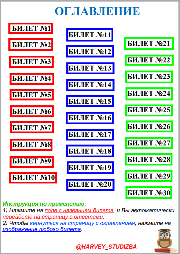 3. На странице «ОГЛАВЛЕНИЕ » представлен перечень билетов. При нажатии на любой из них Вы перейдёте к соответствующей странице с ответами . 📌