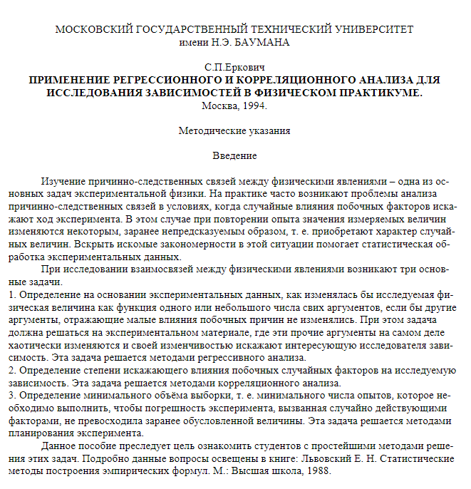 Для студентов МГТУ им. Н.Э.Баумана по предмету ФизикаЕркович С.П. - Применение регрессионного и корреляционного анализа для исследования зависимостей в физическом практикумеЕркович С.П. - Применение регрессионного и корреляционного анализа для исследования зависимостей в физическом практикуме 2018-01-11СтудИзба