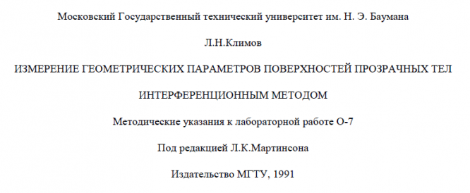 Главная » Учебные материалы » Физика » Книги » МГТУ им. Н.Э.Баумана » 3 семестр » Номер О » Вариант 7 » Измерение геометрических параметров поверхностей прозрачных тел интерференционным методом
