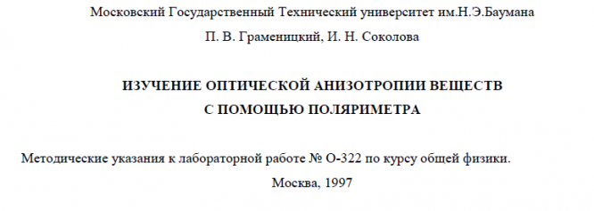 Главная » Учебные материалы » Физика » Книги » МГТУ им. Н.Э.Баумана » 3 семестр » Номер О » Вариант 322 » Изучение оптической анизотропии веществ с помощью поляриметра