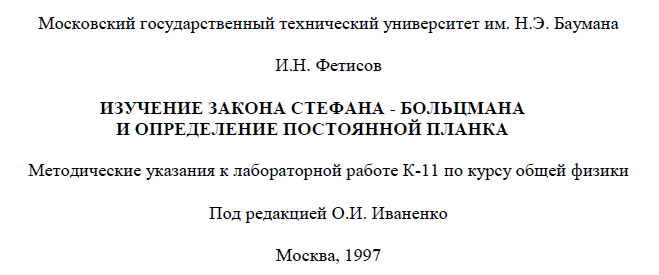 Главная » Учебные материалы » Физика » Книги » МГТУ им. Н.Э.Баумана » 4 семестр » Номер К » Вариант 11 » Изучение закона Стефана-Больцмана и определение постоянной Планка