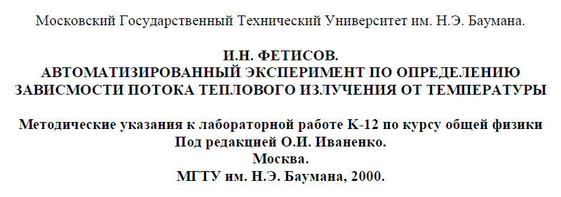 Для студентов МГТУ им. Н.Э.Баумана по предмету ФизикаАвтоматизированный эксперимент по определению зависимости потока теплового излучения от температурыАвтоматизированный эксперимент по определению зависимости потока теплового излучения от температуры
