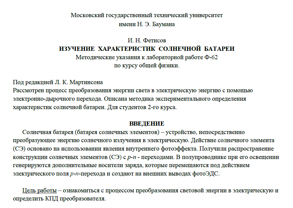Для студентов МГТУ им. Н.Э.Баумана по предмету ФизикаИзучение характеристик солнечной батареиИзучение характеристик солнечной батареи