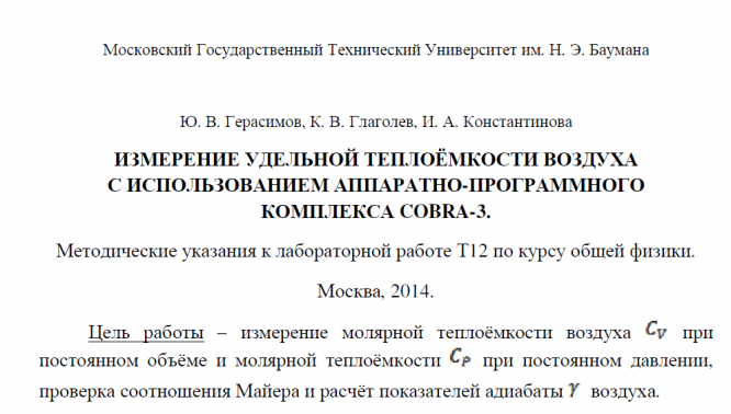 Главная » Учебные материалы » Физика » Книги » МГТУ им. Н.Э.Баумана » 2 семестр » Номер Т » Вариант 12 » Измерение удельной теплоемкости воздуха с использованием аппаратно-программного комплекса COBRA-3