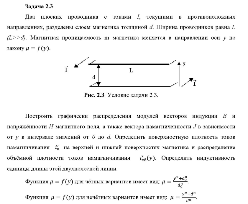 известный параметр. Таблица 1.3. Значения параметров n и d0/d в зависимости от номера варианта  Задача 2.3. Два плоских проводника с токами I, текущими в противоположных направлениях, разделены слоем магнетика толщиной d. Ширина проводников равна L (L>>d). Магнитная проницаемость закону =f(y). Построить графически распределения модулей векторов индукции B и напряжённости H магнитного поля, а также вектора намагниченности J в зависимости от y в интервале значений от 0 до d. Определить поверхностную плотность токов намагничивания i\' распределение объёмной плотности токов намагничивания i\' индуктивность единицы длины этой двухполосной линии. Функция =f(y) для чётных вариантов имеет вид: Функция =f(y) для нечётных вариантов имеет вид: Таблица 2.3.