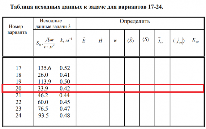 9) записать волновое уравнение для магнитной и электрической компонент рассматриваемой электромагнитной волны и изобразить схематично мгновенную фотографию этой волны. Таблица исходных данных к задаче для вариантов 17-24 .