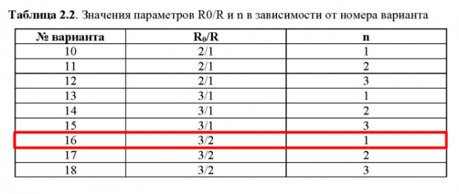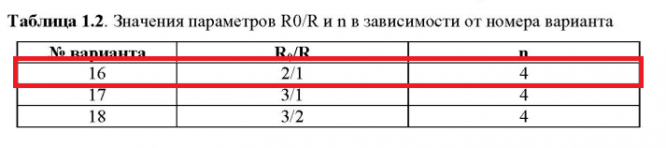 Функция =f(r) для чётных вариантов имеет вид: =(R0 n +rn )/(R0 n +Rn ). Функция =f(r) для нечётных вариантов имеет вид: =(Rn +rn )/2Rn . Таблица 2.2. Значения параметров R0/R и n в зависимости от номера варианта.