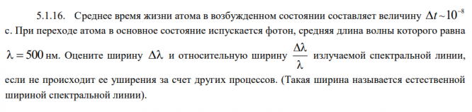 5.1.16. Среднее время жизни атома в возбужденном состоянии составляет величину t ~ 8 10 с. При переходе атома в основное состояние испускается фотон, средняя длина волны которого равна 500 нм. Оцените ширину и относительную ширину излучаемой спектральной линии, если не происходит ее уширения за счет других процессов. (Такая ширина называется естественной шириной спектральной линии). 5.2.16. Частица с энергией E налетает на прямоугольный потенциальный порог высотой U0 . Найдите приближенное выражение для коэффициента отражения R для случая 1 0 E U ..