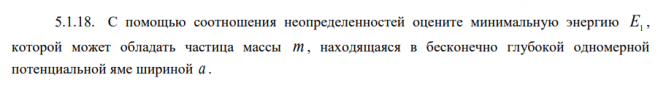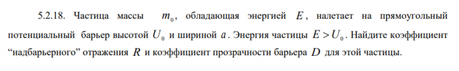 5.1.18. С помощью соотношения неопределенностей оцените минимальную энергию E1 , которой может обладать частица массы m , находящаяся в бесконечно глубокой одномерной потенциальной яме шириной а . 5.2.18. Частица массы m0 , обладающая энергией E , налетает на прямоугольный потенциальный барьер высотой U0 и шириной a . Энергия частицы E U0 . Найдите коэффициент “надбарьерного” отражения R и коэффициент прозрачности барьера D для этой частицы.