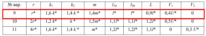 Каждая колебательная система (КС), представленная на рис. 28, 29, 30, 31, состоит из шайбы массой m и двух упругих пружин, имеющих жесткости k1 и k2 . Движение КС происходит в окружающей среде с малыми вязкими свойствами (малым коэффициентом сопротивления r). На рис. 28, 30 шайба колеблется под действием пружин, соединенных параллельно, а на рис. 29, 31 колебания происходят под действием пружин, соединенных последовательно. Массой пружин можно пренебречь. На рис. 28, 29 КС имеет горизонтальное расположение, а на рис. 30, 31 вертикальное расположение в поле силы тяжести. Длины 1-ой и 2-ой пружин в недеформированных состояниях равны l10 и l20. На рис.28, 30 L - длина каждой пружины в деформированном состоянии при t=0. На рис.29, 31 L - общая длина двух пружин в деформированном состоянии при t=0. Возможные векторы начальной скорости шайбы равны V1 , V2 . Шайбу, находящуюся в положении равновесия, смещают до расстояния L, а затем импульсом придают ей в начальный момент времени t=0 скорость V1 или V2 , в соответствии с заданием (см. таблицы № 10 - 13). В результате КС приходит в колебательное движение.