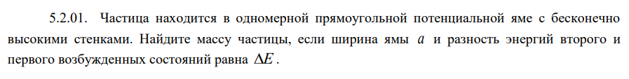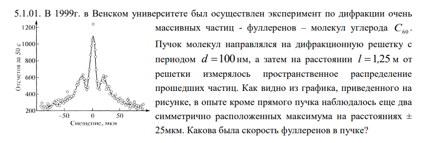5.1.01. В 1999г. в Венском университете был осуществлен эксперимент по дифракции очень массивных частиц - фуллеренов – молекул углерода С60 . Пучок молекул направлялся на дифракционную решетку с периодом d 100 нм, а затем на расстоянии l 1,25 м от решетки измерялось пространственное распределение прошедших частиц. Как видно из графика, приведенного на рисунке, в опыте кроме прямого пучка наблюдалось еще два симметрично расположенных максимума на расстояниях ± 25мкм. Какова была скорость фуллеренов в пучке?  5.2.01. Частица находится в одномерной прямоугольной потенциальной яме с бесконечно высокими стенками. Найдите массу частицы, если ширина ямы a и разность энергий второго и первого возбужденных состояний равна E ..