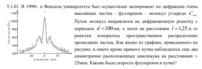 5.1.01. В 1999г. в Венском университете был осуществлен эксперимент по дифракции очень массивных частиц - фуллеренов – молекул углерода С60 . Пучок молекул направлялся на дифракционную решетку с периодом d 100 нм, а затем на расстоянии l 1,25 м от решетки измерялось пространственное распределение прошедших частиц. Как видно из графика, приведенного на рисунке, в опыте кроме прямого пучка наблюдалось еще два симметрично расположенных максимума на расстояниях ± 25мкм. Какова была скорость фуллеренов в пучке? 5.2.01. Частица находится в одномерной прямоугольной потенциальной яме с бесконечно высокими стенками. Найдите массу частицы, если ширина ямы a и разность энергий второго и первого возбужденных состояний равна E ..