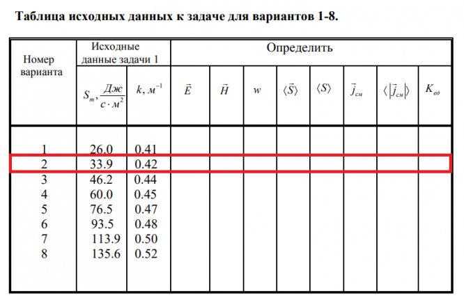 9) записать волновое уравнение для магнитной и электрической компонент рассматриваемой электромагнитной волны и изобразить схематично мгновенную фотографию этой волны. Таблица исходных данных к задаче для вариантов 1-8..