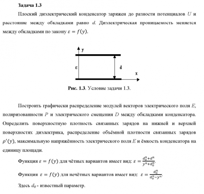 Таблица 1.3. Значения параметров n и d варианта Плоский диэлектрический конденсатор заряжен до разности потенциалов U и расстояние между обкладками равно d. Диэлектрическая проницаемость меняется между обкладками по закону =f(y). Построить графически распределение модулей векторов электрического поля Е, поляризованности Р и электрического смещения D между обкладками конденсатора. Определить поверхностную плотность связанных зарядов на нижней и верхней поверхностях диэлектрика, распределение объёмной плотности связанных зарядов ’(y), максимальную напряжённость электрического поля Е и ёмкость конденсатора =f(у) для нечётных вариантов имеет вид: =(d0 n +dn )/(y =f(y) для чётных вариантов имеет вид: =d0 n /(d0 n -y n ).