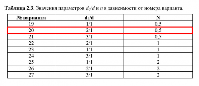 Значения параметров d0/d и n в зависимости от номера варианта..