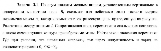 Задача 3.1. По двум гладким медным шинам, установленным вертикально в однородном магнитном поле B скользит под действием силы тяжести медная перемычка массы m, которая замыкает электрическую цепь, приведенную на рисунке. Расстояние между шинами l. Сопротивления шин, перемычки и скользящих контактов, а также самоиндукция контура пренебрежимо малы. Найти закон движения перемычки Y(t) при условии, что начальная скорость, ток через индуктивность и заряд на конденсаторе равны 0, Y(0)=Y0. L C L B B B R R C Y Рис.3.1.1 Рис.3.1.2 Рис.3.1.3 L C L R R C B B B 0 Рис.3.1.4 Рис.3.1.5 Рис.3.1.6 Таблица 3.1.1 Номера вариантов и значения параметров L , R , C для соответствующего номера рисунка.   Варианты 1-8.