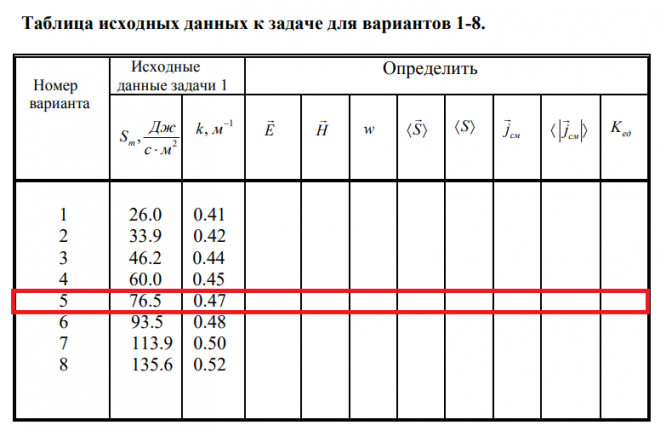 9) записать волновое уравнение для магнитной и электрической компонент рассматриваемой электромагнитной волны и изобразить схематично мгновенную фотографию этой волны. Таблица исходных данных к задаче для вариантов 1-8..