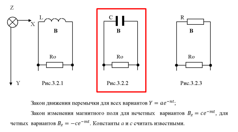 Найти: - закон изменения тока I (t); - максимальное значение тока I max; - закон изменения проекций силы Лоренца на ось X (Fлx) и на ось Y (Fлy), действующей на электрон ; - закон изменения напряженности электрического поля в перемычке E(t); - силу F(t), действующую на перемычку, необходимую для обеспечения заданного закона движения ; - установить связь между силой Ампера, действующей на перемычку, и силой Лоренца, действующей на все электроны в перемычке. Z L C R X B B B Ro Ro Ro Y Рис.3.2.1 Рис.3.2.2 Рис.3.2.3 Закон движения перемычки для всех вариантов Y = a exp(- nt); Закон изменения магнитного поля для нечетных вариантов ВZ = c exp(- mt), для четных вариантов ВZ = -c exp(- mt).