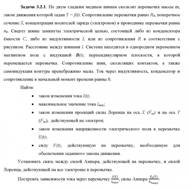 Задача 3.2.1 По двум гладким медным шинам скользит перемычка массы m, закон движения которой задан Y = f(t). Сопротивление перемычки равно Ro, поперечное сечение S, концентрация носителей заряда (электронов) в проводнике перемычки равна n0. Сверху шины замкнуты электрической цепью, состоящей либо из конденсатора ёмкости С, либо из индуктивности L или из сопротивления R в соответствии с рисунком. Расстояние между шинами l. Система находится в однородном переменном магнитном поле с индукцией B(t), перпендикулярном плоскости, в которой перемещается перемычка. Сопротивление шин, скользящих контактов, а также самоиндукция контура пренебрежимо малы. Ток через индуктивность, конденсатор и сопротивление в начальный момент времени равен 0.