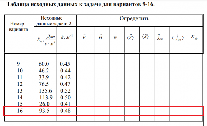 9) записать волновое уравнение для магнитной и электрической компонент рассматриваемой электромагнитной волны и изобразить схематично мгновенную фотографию этой волны. Таблица исходных данных к задаче для вариантов 9-16 .