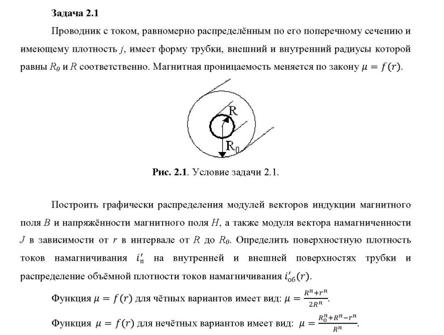 Значения параметров n и R0/R в зависимости от номера варианта  Задача 2.1. Проводник с током, равномерно распределённым по его поперечному сечению и имеющему плотность j, имеет форму трубки, внешний и внутренний радиусы которой равны R0 и R соответственно. Магнитная проницаемость меняется по закону =f(r). Построить графически распределения модулей векторов индукции магнитного поля B и напряжённости магнитного поля H, а также модуля вектора намагниченности J в зависимости от r в интервале от R до R0. Определить поверхностную плотность токов намагничивания i\'п на внутренней и внешней поверхностях трубки и распределение объёмной плотности токов намагничивания i\'об(r).