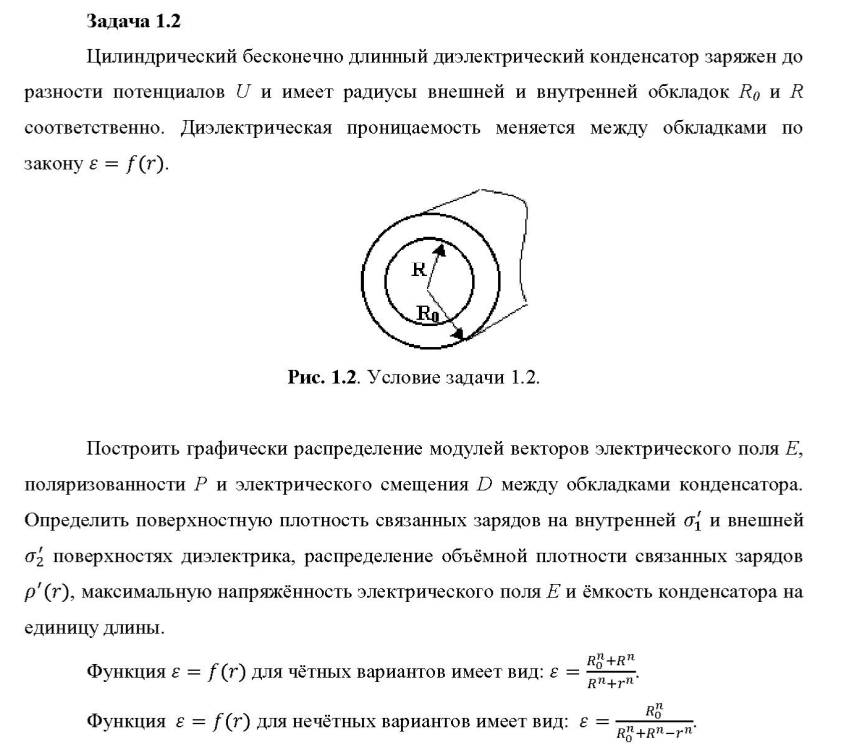 Задача 1.2. Цилиндрический бесконечно длинный диэлектрический конденсатор заряжен до разности потенциалов U и имеет радиусы внешней и внутренней обкладок R соответственно. Диэлектрическая проницаемость меняется между обкладками по закону f(r). Построить графически распределение модулей векторов электрического поля Е, поляризованности Р и электрического смещения D между обкладками конденсатора. Определить поверхностную плотность связанных зарядов на внутренней внешней \' 2 поверхностях диэлект связанных зарядов ’(r), максимальную напряжённость электрического поля Е и ёмкость конденсатора на единицу длины. Функция =f(r) для нечётных вариантов имеет вид: Функция =f(r) для чётных вариантов имеет вид: Таблица 1.2.