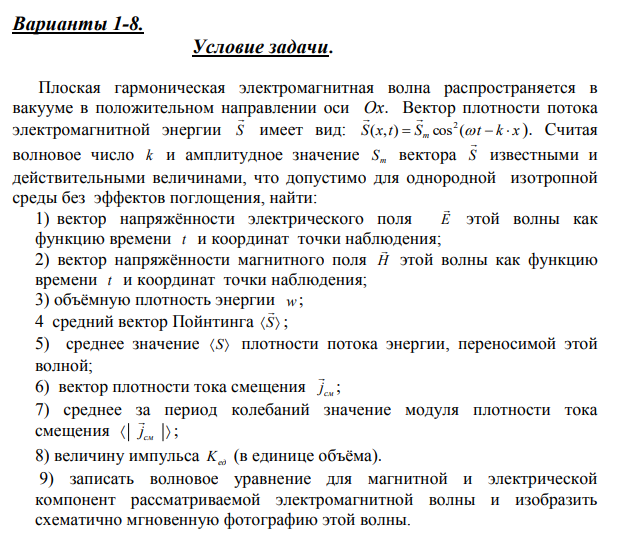 Условие задачи. Плоская гармоническая электромагнитная волна распространяется в вакууме в положительном направлении оси Ox. Вектор плотности потока электромагнитной энергии S  имеет вид: S x t S t k x m ( , )  cos (   2   ). Считая волновое число k и амплитудное значение m S вектора S  известными и действительными величинами, что допустимо для однородной изотропной среды без эффектов поглощения, найти: 1) вектор напряжённости электрического поля E  этой волны как функцию времени t и координат точки наблюдения; 2) вектор напряжённости магнитного поля H  этой волны как функцию времени t и координат точки наблюдения; 3) объёмную плотность энергии w ; 4 средний вектор Пойнтинга S  ; 5) среднее значение S плотности потока энергии, переносимой этой волной; 6) вектор плотности тока смещения см j  ; 7) среднее за период колебаний значение модуля плотности тока смещения   см j  ; 8) величину импульса Kед (в единице объёма).